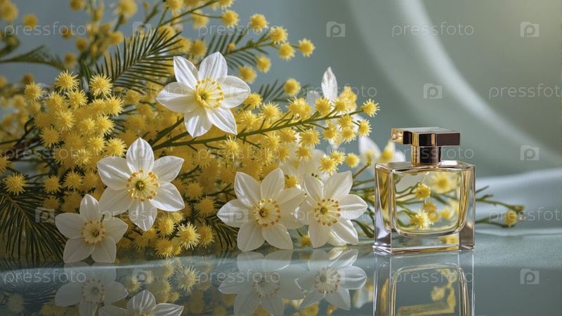 Парфюмерная бутылка с мимозой и белыми цветами нарцисса