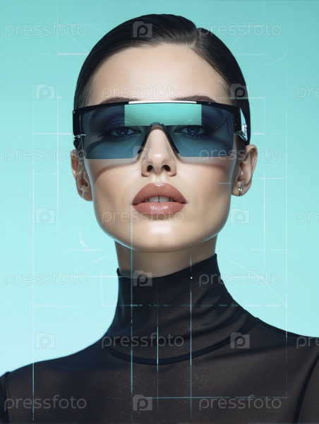 Футуристическая молодая женщина с скользкими волосами, черной водолазкой и киберпанковским головным убором на цифровом синем фоне