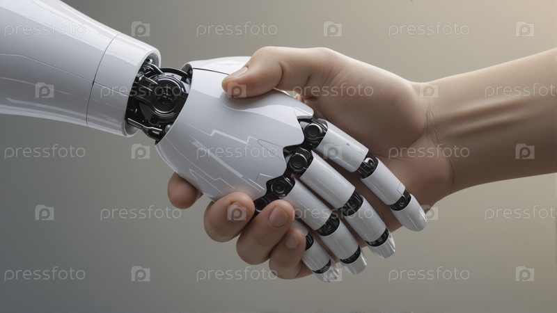 Рука человека пожимает руки роботизированной рукой, символизирующей технологическое партнерство и сотрудничество в области ИИ