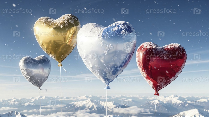 Заснеженные сердечные шары парят над зимними горными пиками