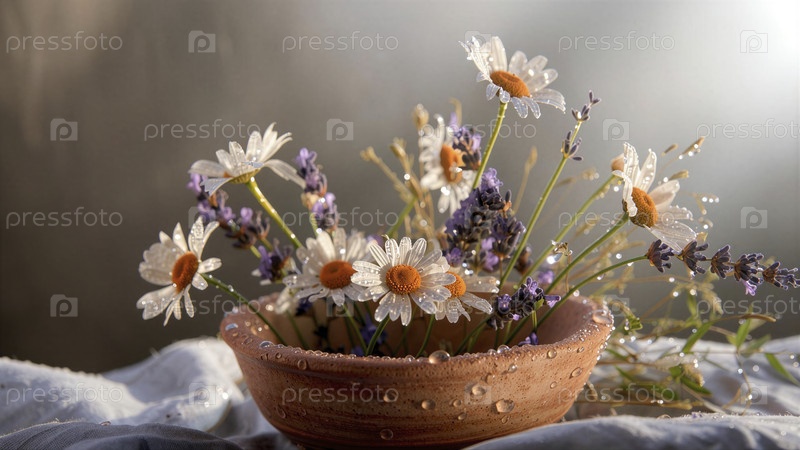 Покрытые росой дикие цветы в глиняной чаше