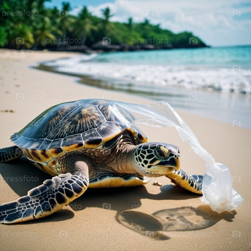 Морская черепаха поймана в пластиковый пакет на песчаном пляже недалеко от океана. Его тело лежит на песке. Изображение подчеркивает опасность пластикового загрязнения в океане и необходимость защиты окружающей среды. генерируемый