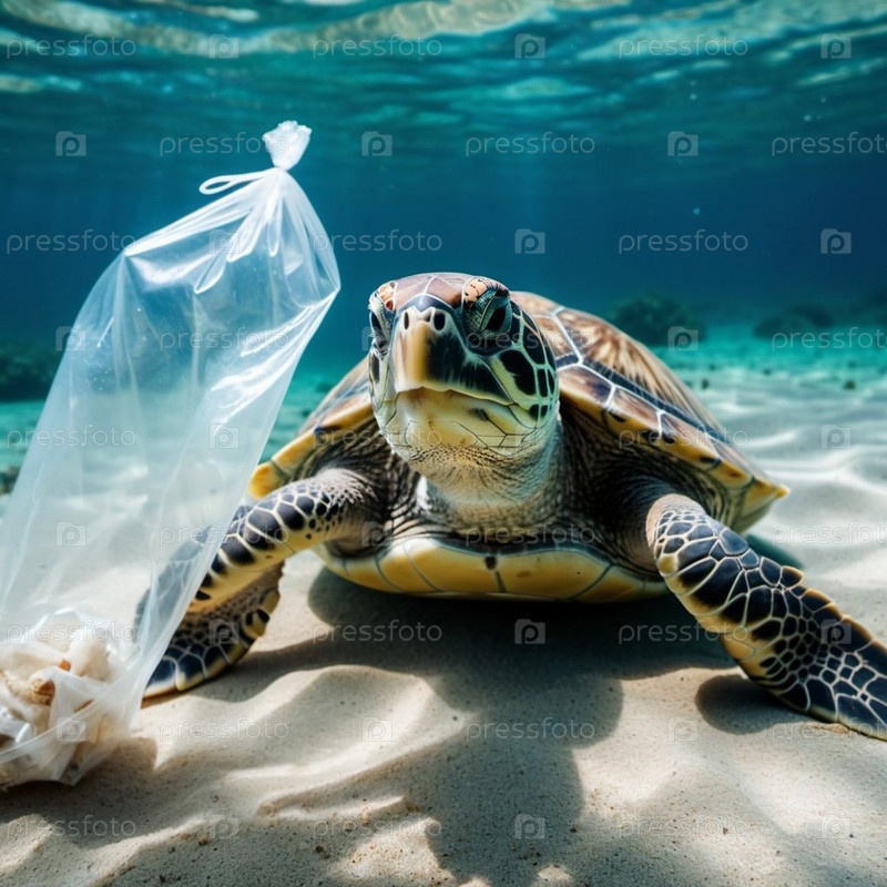 Морская черепаха поймана в пластиковый пакет на песчаном пляже недалеко от океана. Его тело лежит на песке. Изображение подчеркивает опасность пластикового загрязнения в океане и необходимость защиты окружающей среды. генерируемый