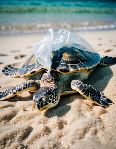 Морская черепаха поймана в пластиковый пакет на песчаном пляже недалеко от океана. Его тело лежит на песке. Изображение подчеркивает опасность пластикового загрязнения в океане и необходимость защиты окружающей среды. генерируемый