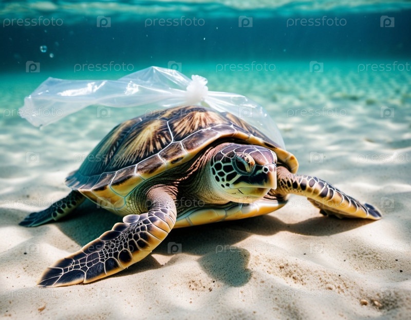 Морская черепаха поймана в пластиковый пакет на песчаном пляже недалеко от океана. Его тело лежит на песке. Изображение подчеркивает опасность пластикового загрязнения в океане и необходимость защиты окружающей среды. генерируемый