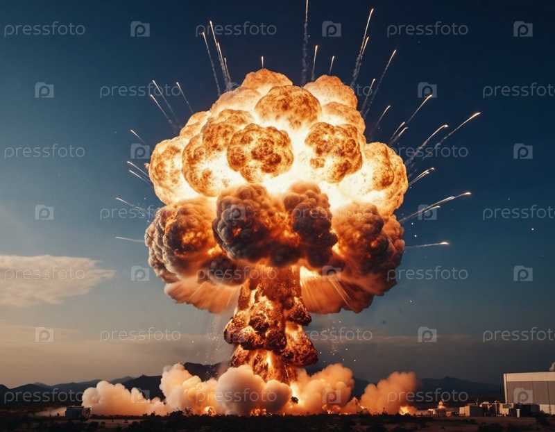 Ядерный взрыв — это процесс высвобождения большого количества тепловой и лучистой энергии в результате неконтролируемой цепной реакции ядерного деления за очень короткое время. Сгенерированный ИИ. Термоядерный синтез