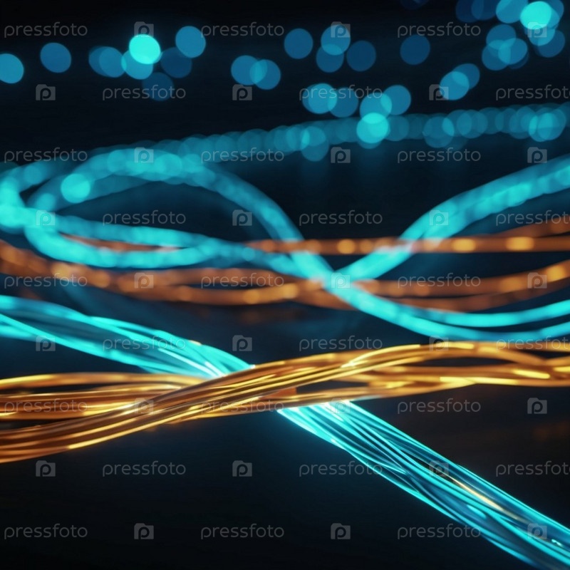 Голубые и оранжевые светящиеся провода скручиваются и переплетаются на темном фоне с боке. Черные кабели и разъемы со светящимися огнями и цепями соединяются, чтобы сформировать сеть. генерируемый