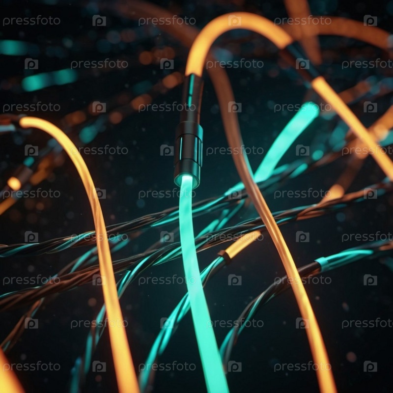 Голубые и оранжевые светящиеся провода скручиваются и переплетаются на темном фоне с боке. Черные кабели и разъемы со светящимися огнями и цепями соединяются, чтобы сформировать сеть. генерируемый