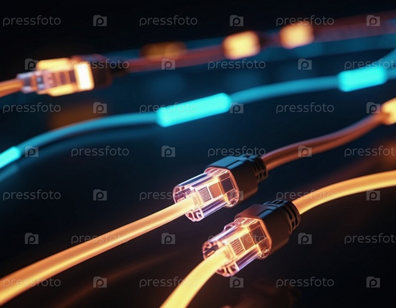 Голубые и оранжевые светящиеся провода скручиваются и переплетаются на темном фоне с боке. Черные кабели и разъемы со светящимися огнями и цепями соединяются, чтобы сформировать сеть. генерируемый
