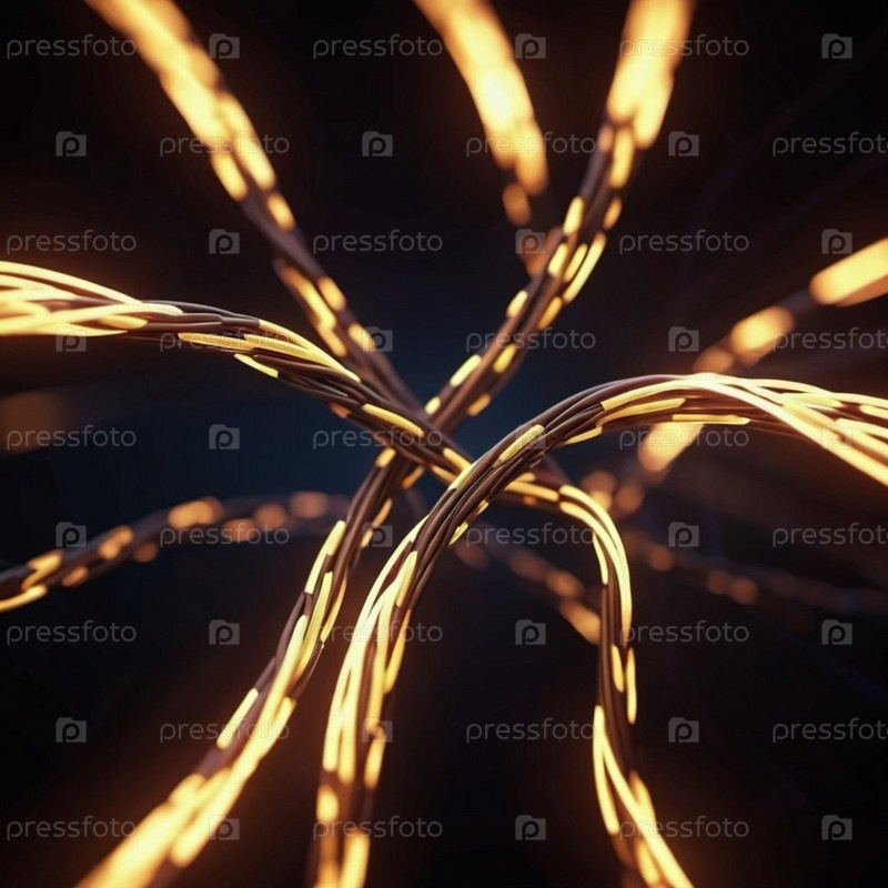 Голубые и оранжевые светящиеся провода скручиваются и переплетаются на темном фоне с боке. Черные кабели и разъемы со светящимися огнями и цепями соединяются, чтобы сформировать сеть. генерируемый