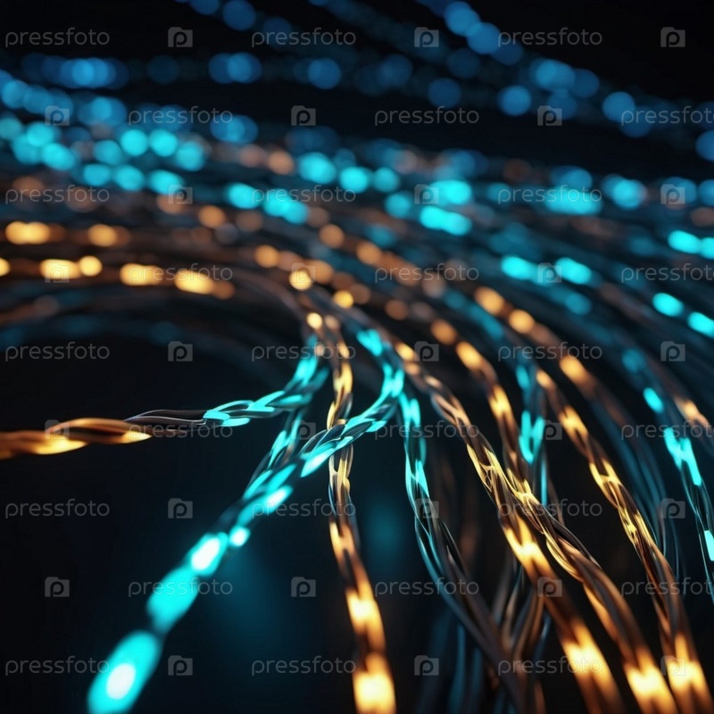 Голубые и оранжевые светящиеся провода скручиваются и переплетаются на темном фоне с боке. Черные кабели и разъемы со светящимися огнями и цепями соединяются, чтобы сформировать сеть. генерируемый