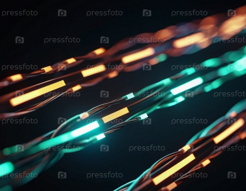 Голубые и оранжевые светящиеся провода скручиваются и переплетаются на темном фоне с боке. Черные кабели и разъемы со светящимися огнями и цепями соединяются, чтобы сформировать сеть. генерируемый