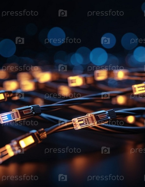 Голубые и оранжевые светящиеся провода скручиваются и переплетаются на темном фоне с боке. Черные кабели и разъемы со светящимися огнями и цепями соединяются, чтобы сформировать сеть. генерируемый