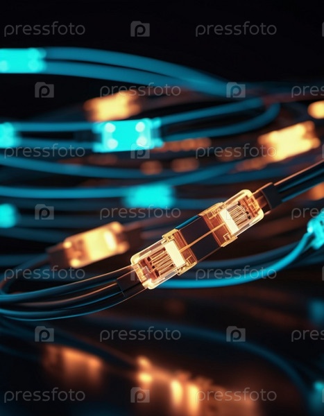 Голубые и оранжевые светящиеся провода скручиваются и переплетаются на темном фоне с боке. Черные кабели и разъемы со светящимися огнями и цепями соединяются, чтобы сформировать сеть. генерируемый