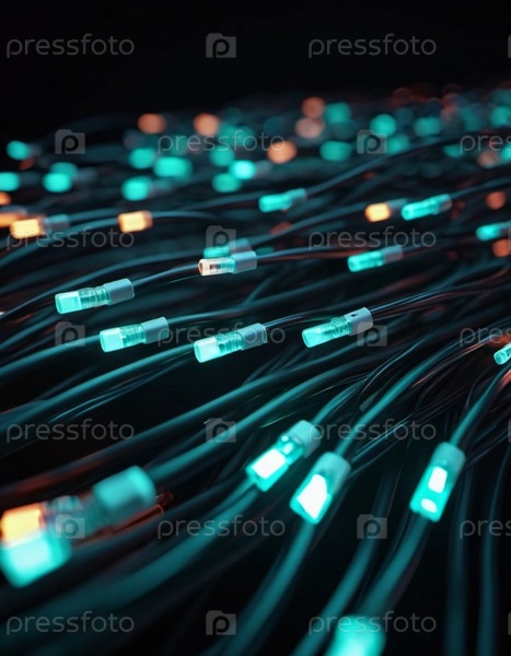 Голубые и оранжевые светящиеся провода скручиваются и переплетаются на темном фоне с боке. Черные кабели и разъемы со светящимися огнями и цепями соединяются, чтобы сформировать сеть. генерируемый