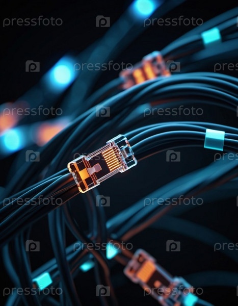 Голубые и оранжевые светящиеся провода скручиваются и переплетаются на темном фоне с боке. Черные кабели и разъемы со светящимися огнями и цепями соединяются, чтобы сформировать сеть. генерируемый