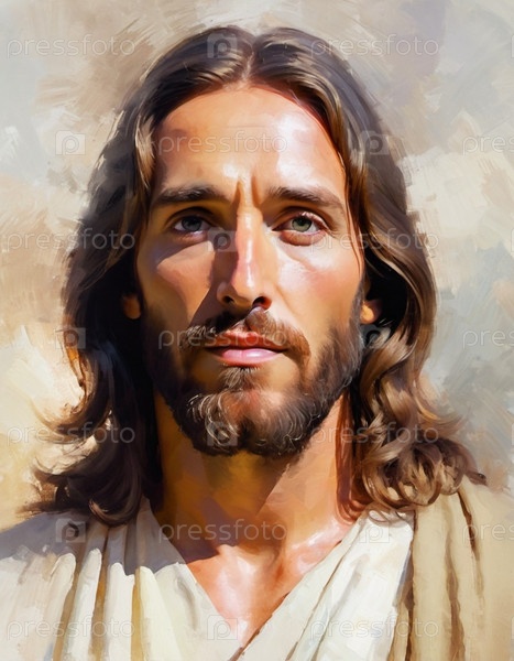 Портрет мужчины, одетого как Иисус. Белый халат. Длинные каштановые волосы и борода. Человеку, по-видимому, около 30 лет, и у него серьезное выражение лица. Христианская религия и вера. ИИ