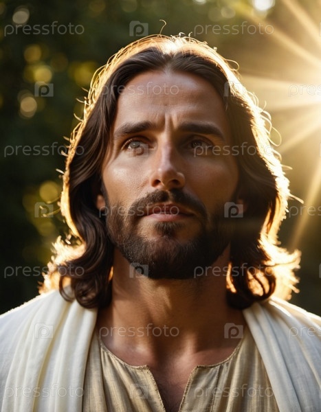 Портрет мужчины, одетого как Иисус. Белый халат. Длинные каштановые волосы и борода. Человеку, по-видимому, около 30 лет, и у него серьезное выражение лица. Христианская религия и вера. ИИ