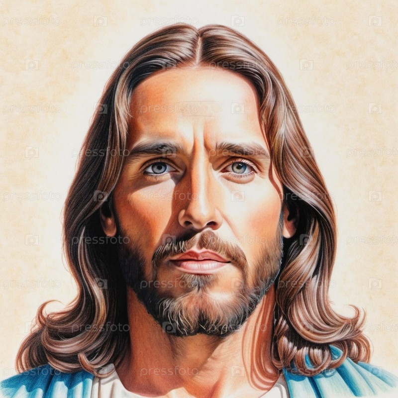 Портрет мужчины, одетого как Иисус. Белый халат. Длинные каштановые волосы и борода. Человеку, по-видимому, около 30 лет, и у него серьезное выражение лица. Христианская религия и вера. ИИ