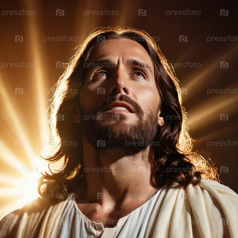 Портрет мужчины, одетого как Иисус. Белый халат. Длинные каштановые волосы и борода. Человеку, по-видимому, около 30 лет, и у него серьезное выражение лица. Христианская религия и вера. ИИ