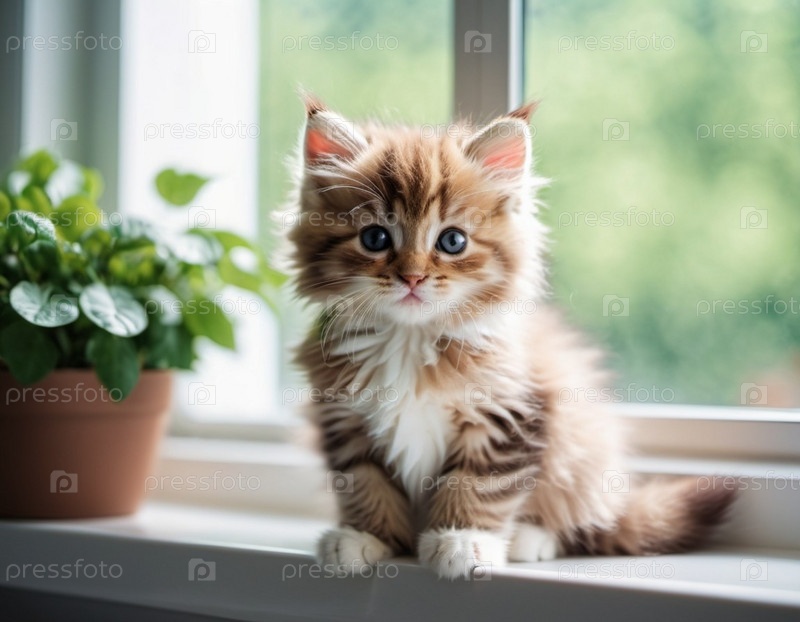 Имбирный котенок с белыми отметинами и большими голубыми глазами сидит на подоконнике. Окно не в фокусе, размытый городской пейзаж на заднем плане. Теплая приглашающая атмосфера. Забота о питомце. Кот грустит дома. ИИ