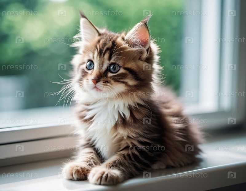 Имбирный котенок с белыми отметинами и большими голубыми глазами сидит на подоконнике. Окно не в фокусе, размытый городской пейзаж на заднем плане. Теплая приглашающая атмосфера. Забота о питомце. Кот грустит дома. ИИ