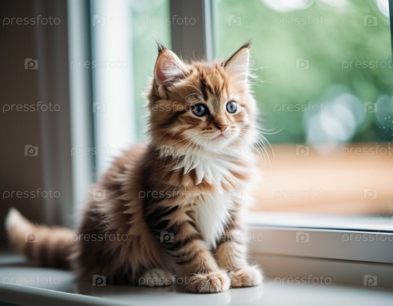 Имбирный котенок с белыми отметинами и большими голубыми глазами сидит на подоконнике. Окно не в фокусе, размытый городской пейзаж на заднем плане. Теплая приглашающая атмосфера. Забота о питомце. Кот грустит дома. ИИ