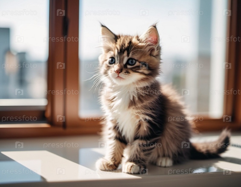 Имбирный котенок с белыми отметинами и большими голубыми глазами сидит на подоконнике. Окно не в фокусе, размытый городской пейзаж на заднем плане. Теплая приглашающая атмосфера. Забота о питомце. Кот грустит дома. ИИ