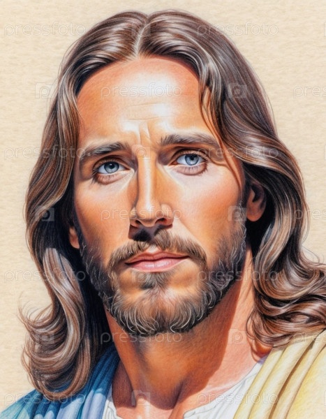 Портрет мужчины, одетого как Иисус. Белый халат. Длинные каштановые волосы и борода. Человеку, по-видимому, около 30 лет, и у него серьезное выражение лица. Христианская религия и вера. ИИ