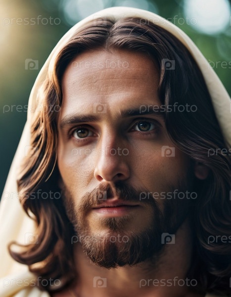 Портрет мужчины, одетого как Иисус. Белый халат. Длинные каштановые волосы и борода. Человеку, по-видимому, около 30 лет, и у него серьезное выражение лица. Христианская религия и вера. ИИ
