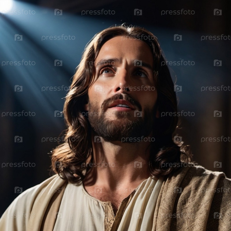 Портрет мужчины, одетого как Иисус. Белый халат. Длинные каштановые волосы и борода. Человеку, по-видимому, около 30 лет, и у него серьезное выражение лица. Христианская религия и вера. ИИ