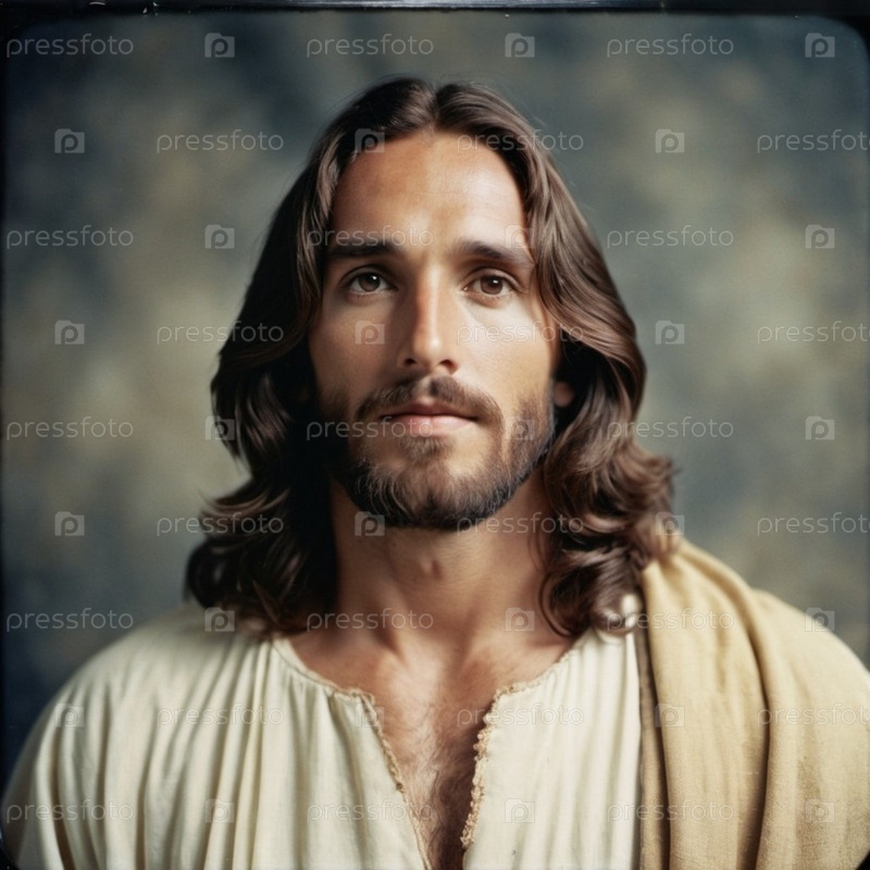Портрет мужчины, одетого как Иисус. Белый халат. Длинные каштановые волосы и борода. Человеку, по-видимому, около 30 лет, и у него серьезное выражение лица. Христианская религия и вера. ИИ