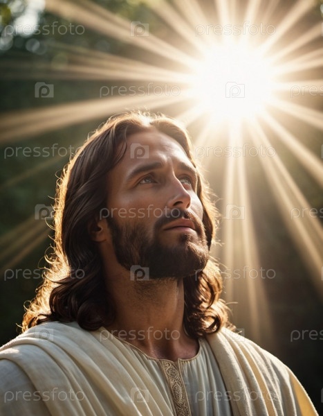 Портрет мужчины, одетого как Иисус. Белый халат. Длинные каштановые волосы и борода. Человеку, по-видимому, около 30 лет, и у него серьезное выражение лица. Христианская религия и вера. ИИ