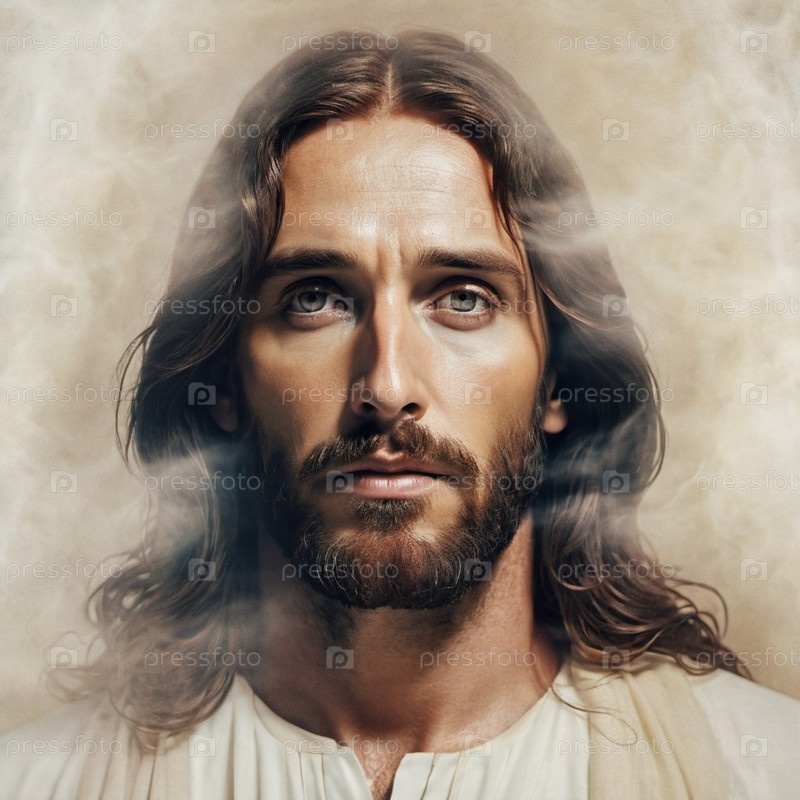 Портрет мужчины, одетого как Иисус. Белый халат. Длинные каштановые волосы и борода. Человеку, по-видимому, около 30 лет, и у него серьезное выражение лица. Христианская религия и вера. ИИ