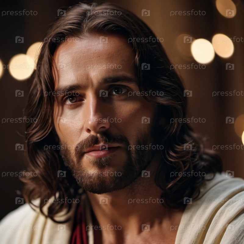 Портрет мужчины, одетого как Иисус. Белый халат. Длинные каштановые волосы и борода. Человеку, по-видимому, около 30 лет, и у него серьезное выражение лица. Христианская религия и вера. ИИ
