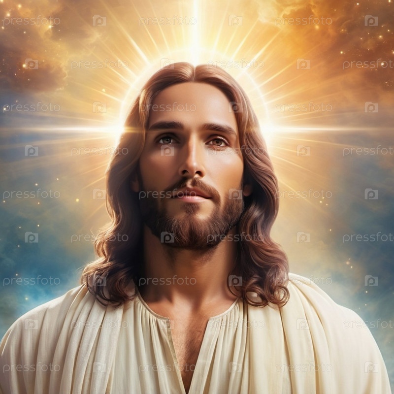 Портрет мужчины, одетого как Иисус. Белый халат. Длинные каштановые волосы и борода. Человеку, по-видимому, около 30 лет, и у него серьезное выражение лица. Христианская религия и вера. ИИ
