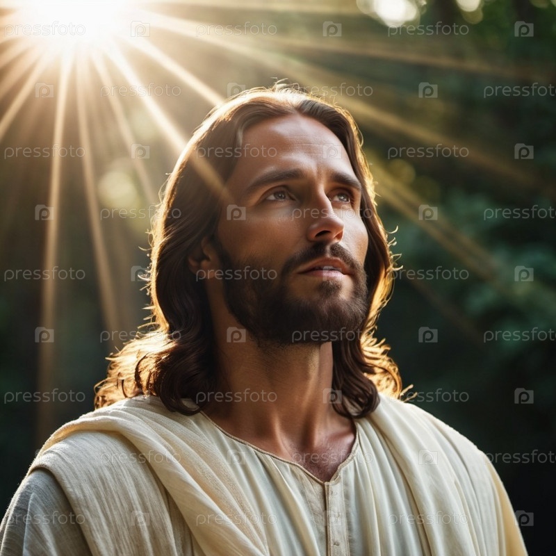 Портрет мужчины, одетого как Иисус. Белый халат. Длинные каштановые волосы и борода. Человеку, по-видимому, около 30 лет, и у него серьезное выражение лица. Христианская религия и вера. ИИ