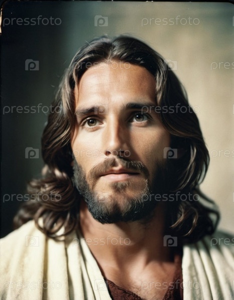 Портрет мужчины, одетого как Иисус. Белый халат. Длинные каштановые волосы и борода. Человеку, по-видимому, около 30 лет, и у него серьезное выражение лица. Христианская религия и вера. ИИ