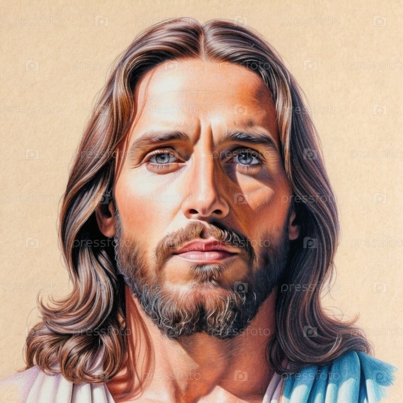 Портрет мужчины, одетого как Иисус. Белый халат. Длинные каштановые волосы и борода. Человеку, по-видимому, около 30 лет, и у него серьезное выражение лица. Христианская религия и вера. ИИ