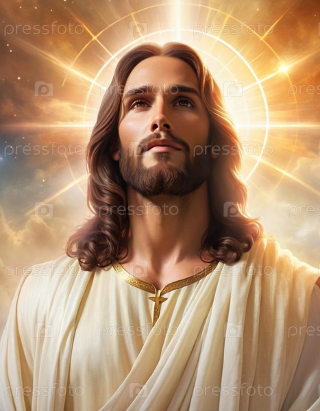Портрет мужчины, одетого как Иисус. Белый халат. Длинные каштановые волосы и борода. Человеку, по-видимому, около 30 лет, и у него серьезное выражение лица. Христианская религия и вера. ИИ
