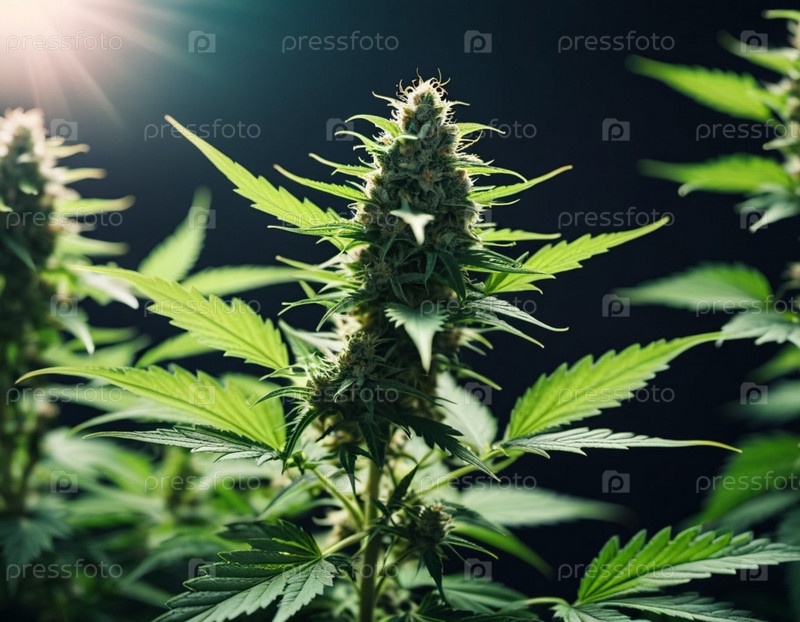 Растение марихуаны в полном расцвете. Листья яркие зеленые. Описание роста и развития растений. ИИ