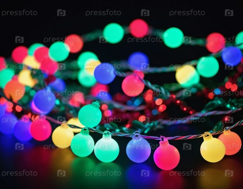 Рождественские огни на темной поверхности. Световая смесь красного, зеленого, желтого и синего. Огни нанизаны в извращенной манере, создавая ощущение движения и прихоти. Праздничная и приглашающая атмосфера. Дизайн Xmas
