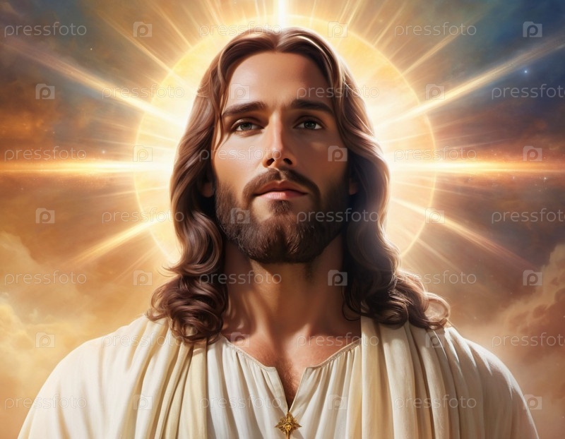 Портрет мужчины, одетого как Иисус. Белый халат. Длинные каштановые волосы и борода. Человеку, по-видимому, около 30 лет, и у него серьезное выражение лица. Христианская религия и вера. генерируемый