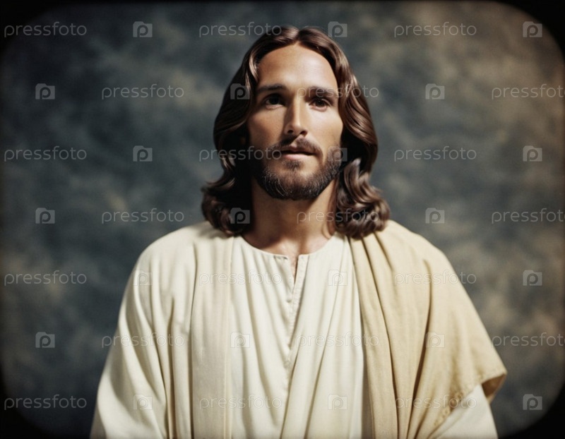 Статуя мужчины, одетого как Иисус. Белый халат. Длинные каштановые волосы и борода. Человеку, по-видимому, около 30 лет, и у него серьезное выражение лица. Христианская религия и вера. генерируемый