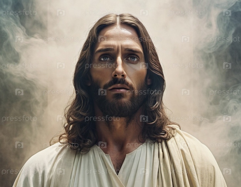 Портрет мужчины, одетого как Иисус. Белый халат. Длинные каштановые волосы и борода. Человеку, по-видимому, около 30 лет, и у него серьезное выражение лица. Христианская религия и вера. генерируемый