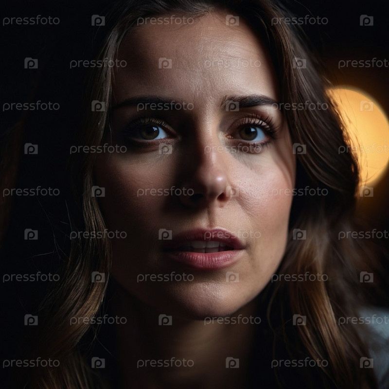 Женщина с нахмуренными бровями и обеспокоенным выражением лица смотрит прямо в камеру. Освещение тусклое, отбрасывая тени вокруг лица, подчеркивая ее стресс. Страх, разочарование, расстройство, беспокойство и вдумчивость. ИИ