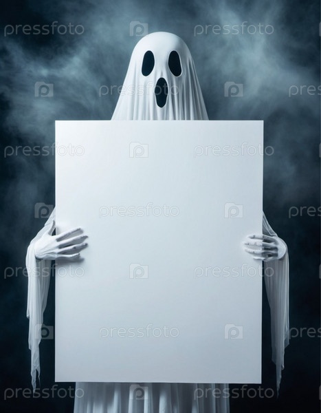 Призрак держит белый белый плакат. Призрачная фигура, одетая в белый лист, держит пустой знак перед туманным фоном. Призрачное черепное лицо. Страшный образ. Свободное пространство для создания надписей