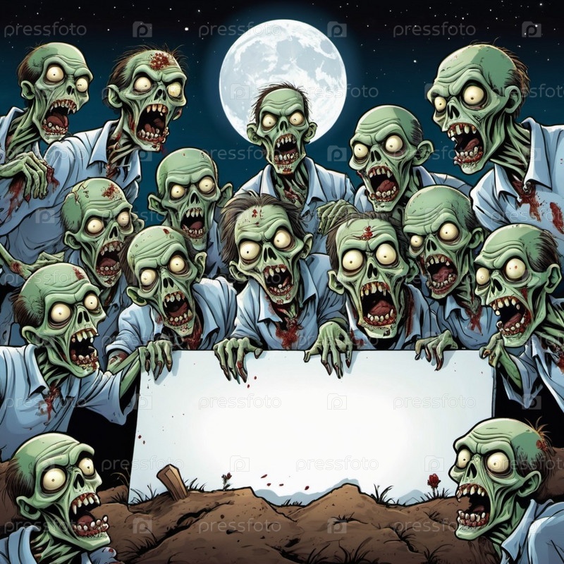 Большая группа зомби, их лица искажены в выражениях голода и упадка, держат пустой знак, их бледная, разлагающаяся кожа и пятна крови видны. Мертвые поднимаются на кладбище ночью. ИИ