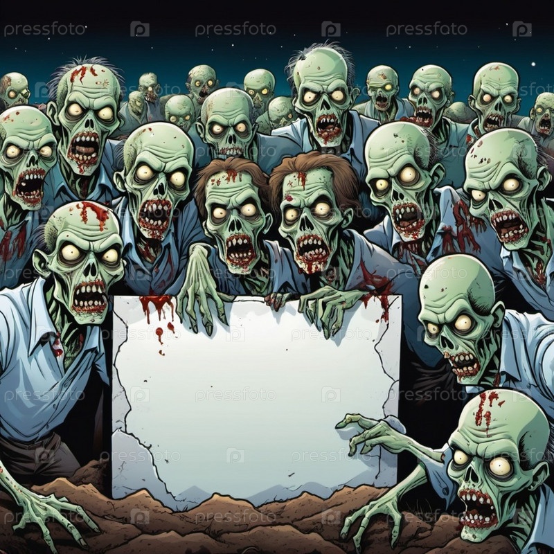 Большая группа зомби, их лица искажены в выражениях голода и упадка, держат пустой знак, их бледная, разлагающаяся кожа и пятна крови видны. Мертвые поднимаются на кладбище ночью. ИИ