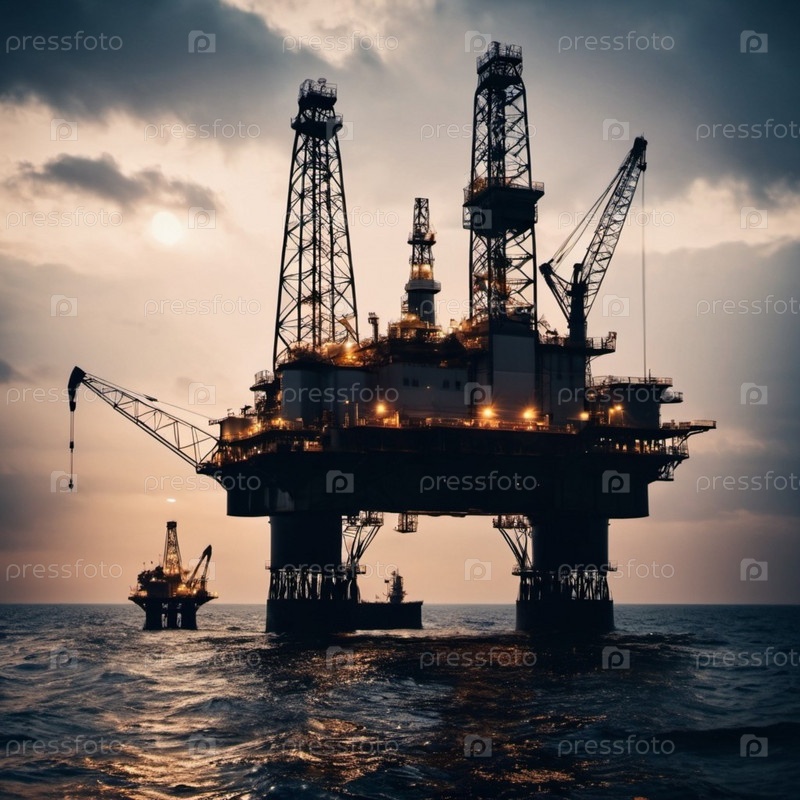 Большая, освещенная морская нефтяная вышка стоит высоко в воде в сумерках. Огни буровой установки бросают теплое свечение на темнеющее небо, а силуэт платформы обрамлен рябью воды. ИИ